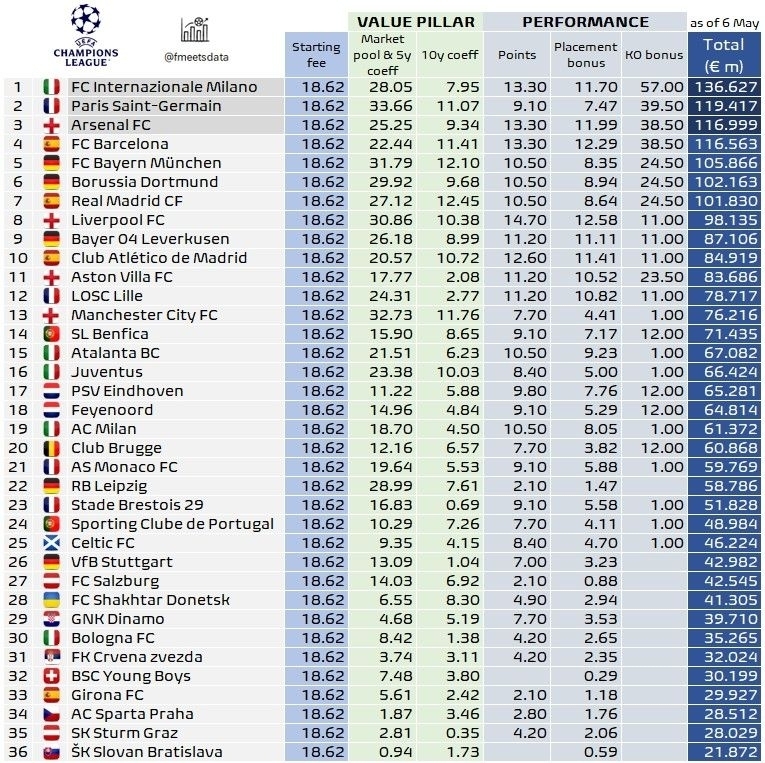这些数据展示了各队在欧冠赛场上的经济收益,国米凭借出色的表现位居榜首,而其他球队也在为晋级决赛和更高的奖金而努力。