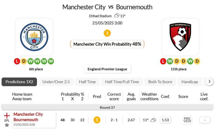 Bournemouth has won only one match in their last 12 games against Manchester City.