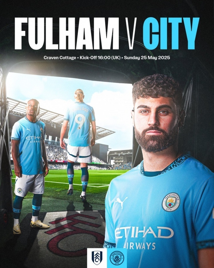 nba直播讯 北京时间5月25日,今天晚上23点,曼城将在英超最后一轮比赛中客场对阵富勒姆,今天晚上23点,曼城将在英超最后一轮比赛中客场对阵富勒姆,对此曼城官方社媒发布了为此役制作的海报,格瓦迪奥尔、多库、哈兰德出镜。