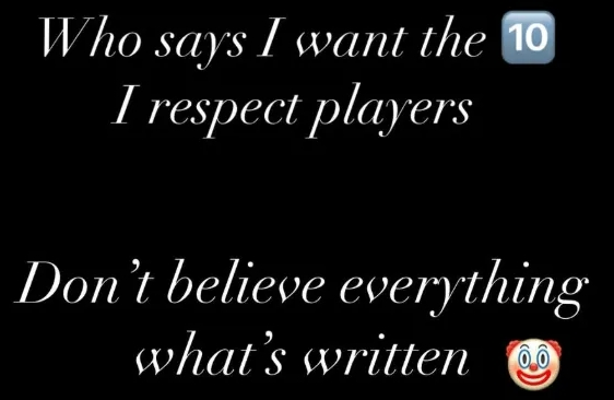 “谁说我想要10号球衣的?我尊重其他球员。别信被报道的一切。”他在文末发布了小丑表情,嘲讽发布虚假新闻的人。