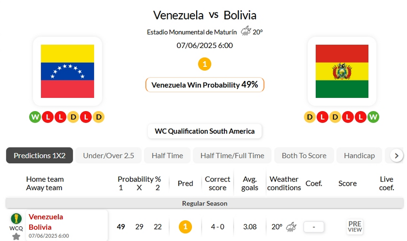 委内瑞拉最近与玻利维亚的比赛得分很高,在过去的5场比赛中都有超过2.5个进球