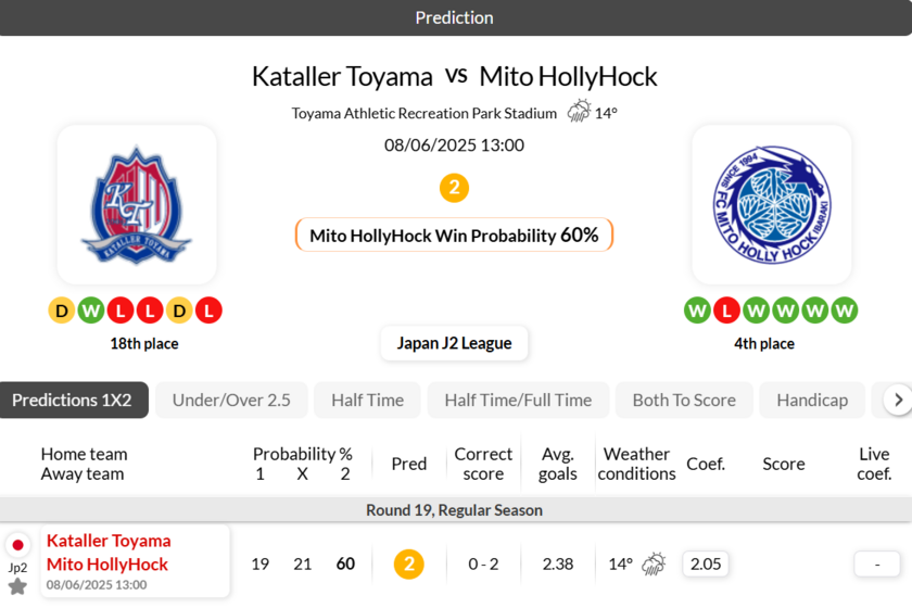 - Kataller Toyama's performance has been disappointing of late, as they have won just 1 of their 14 most recent J2 League clashes.