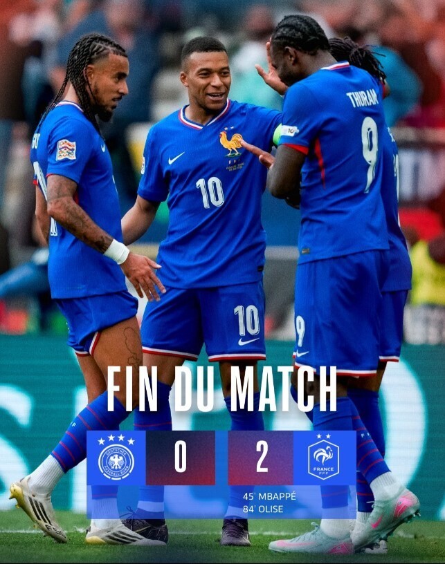 在法国与德国之间进行的季军赛中,法国队凭借当家球星姆巴佩的一传一射,客场2-0完胜德国队。姆巴佩先是在上半场补时阶段打破僵局,随后又助攻奥利塞锁定胜局,帮助法国队收获本届欧国联季军荣誉。