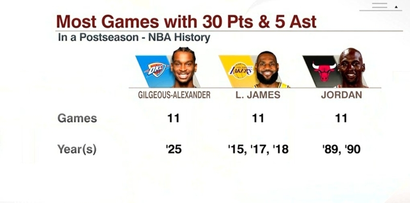 此前,乔丹在1989年季后赛和1990年季后赛都是11次砍下至少30分+5助攻,在1992年季后赛也有10次砍下至少30分+5助攻。詹姆斯则在2015年季后赛、2017年季后赛和2018年季后赛都是11次砍下至少30分+5助攻。