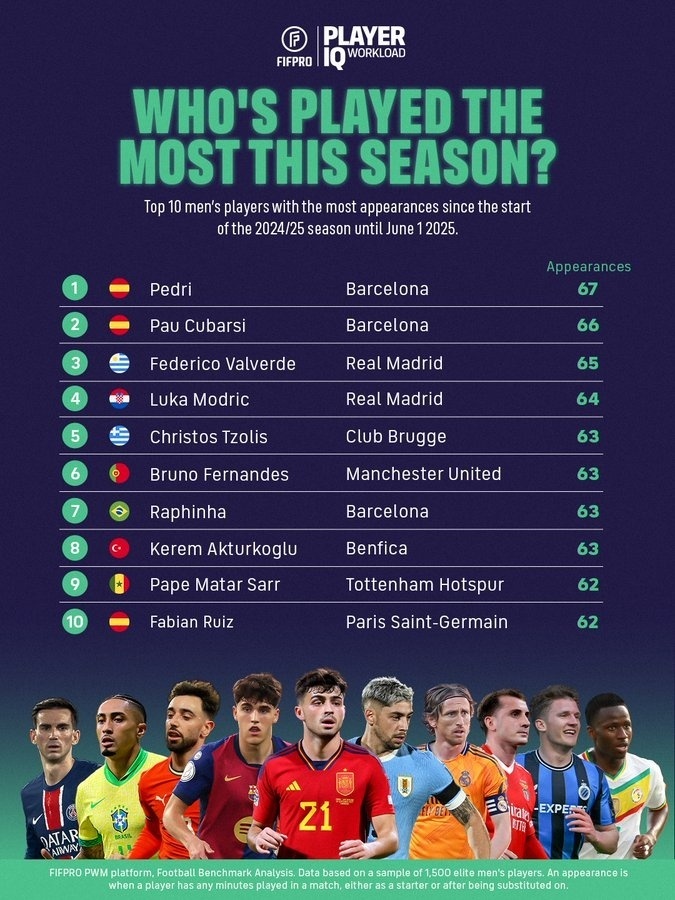 FIFPro列出2024-25赛季(截止至6月1日)男足运动员的出场排名: