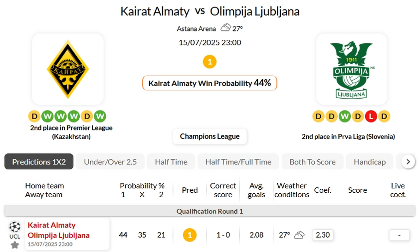 阿拉木图凯拉特首回合占据优势,球队在首回合客场与对手战平,回到主场可能占据优势。