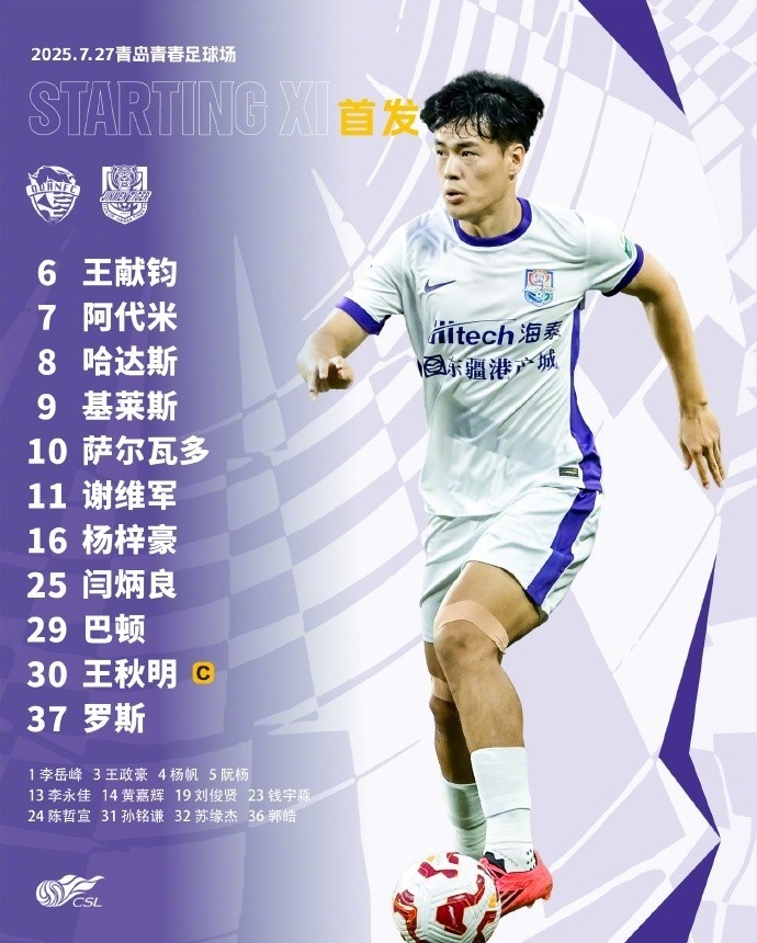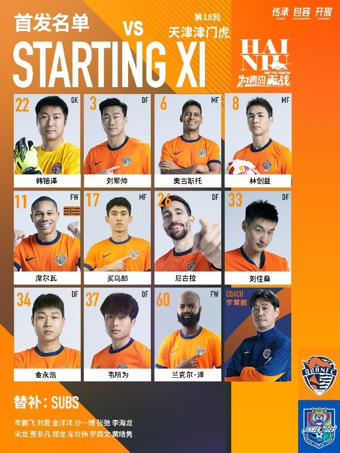 nba直播讯 北京时间7月26日,中超第18轮,青岛海牛主场vs天津津门虎,赛前双方公布了首发名单4外援PK5外援,刘军帅先发,王秋明、巴顿出战。