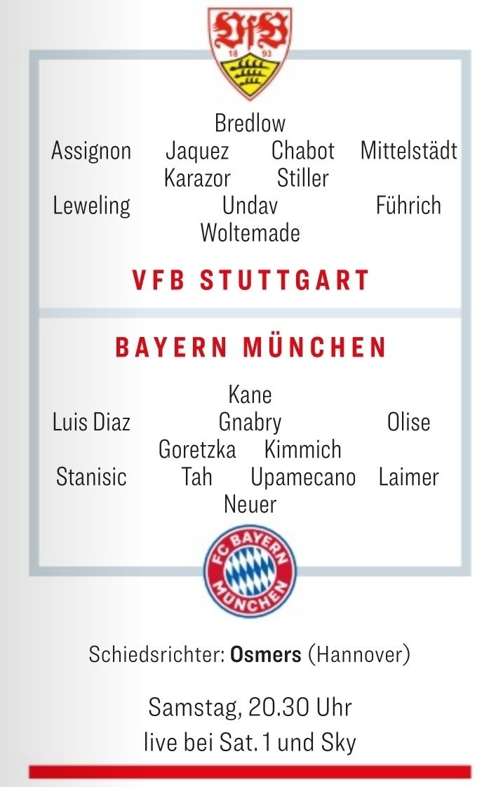 nba直播讯 北京时间8月14日, 在8月17日凌晨两点半,德超杯将在拜仁与斯图加特的对决中产生,德媒踢球者为此役双方首发进行了预测,路易斯-迪亚斯首发,沃尔特马德出战。