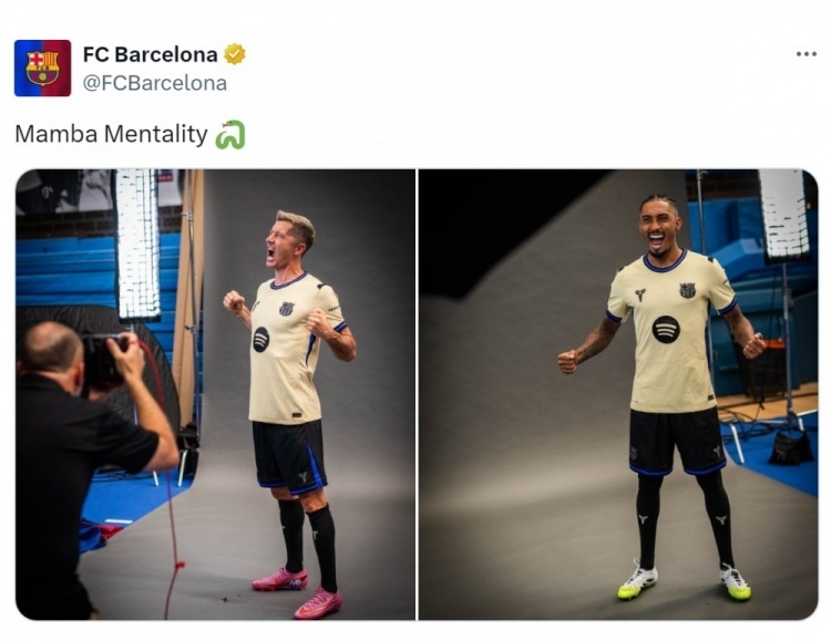 nba直播讯 北京时间8月14日, 巴萨官方晒出莱万与拉菲尼亚身穿科比联名球衣定妆照并配文:曼巴精神。