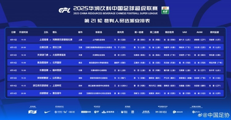 nba直播讯 北京时间8月15日,中超官方公布第21轮裁判安排,艾堃执法浙江队vs申花,王迪执法亚泰vs梅州保级大战。