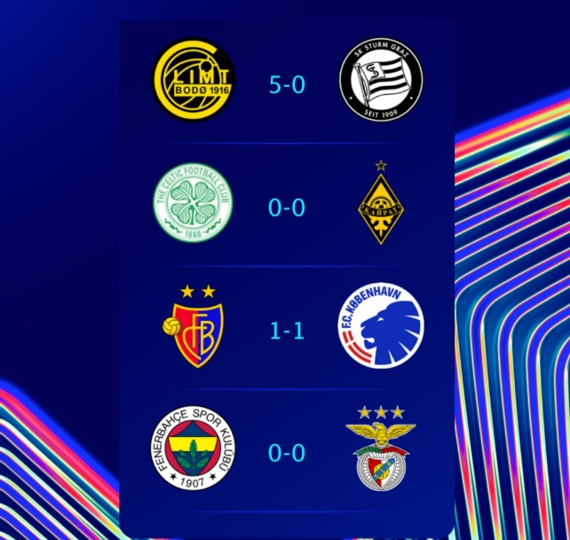其他三场比赛均打成平手,凯尔特人0-0阿特木图凯拉特,巴塞尔1-1哥本哈根,费内巴切0-0本菲卡。