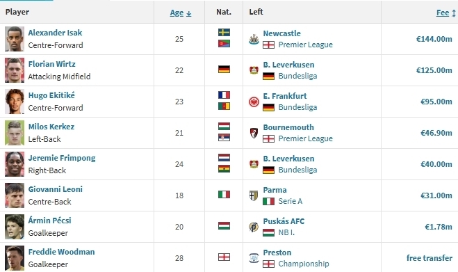 6. 伊萨克:从纽卡斯尔引进,转会费约1.44亿欧元。