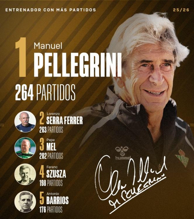 本场比赛,贝蒂斯主帅佩莱格里尼也迎来里程碑。此役是他执教皇家贝蒂斯的第264场比赛,他也正式超越塞拉·费雷尔成为皇家贝蒂斯队史执教场次最多的主教练。