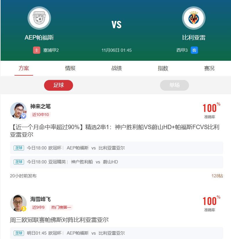 周三009欧冠推荐:帕福斯VS比利亚雷亚尔