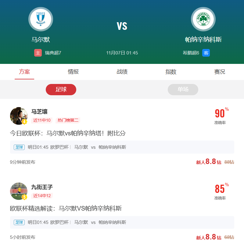 周四010欧罗巴推荐:马尔默VS帕纳辛纳科斯