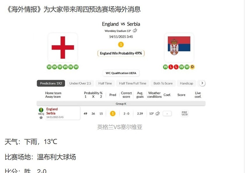 海外情报精准命中!主队已提前出线!海外情报:英格兰2-0塞尔维亚