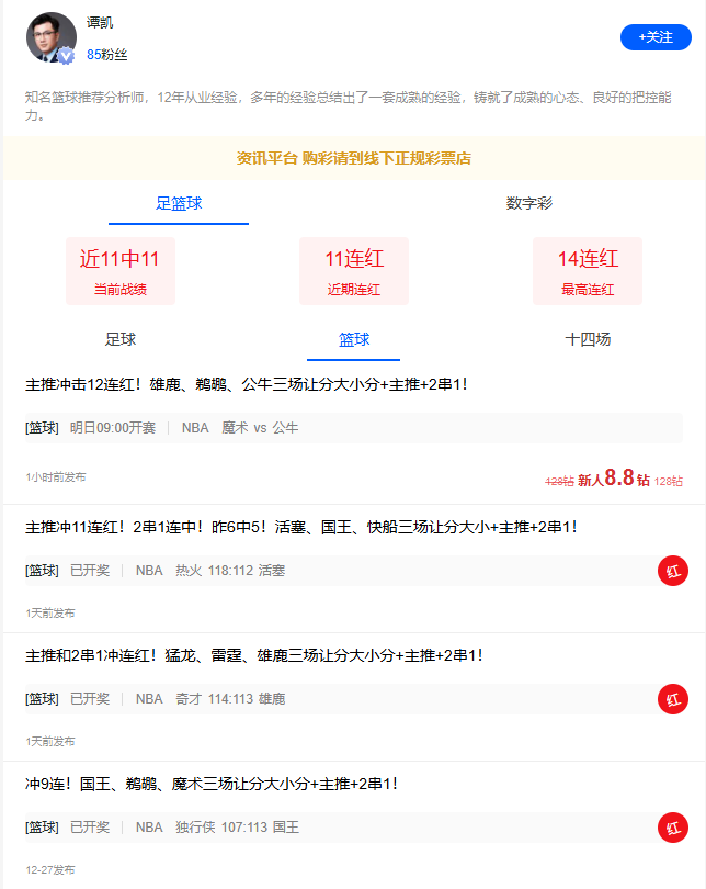 11连红大爆发!知名篮球推荐分析师谭凯精选篮球重心,跟车收米点击不迷路