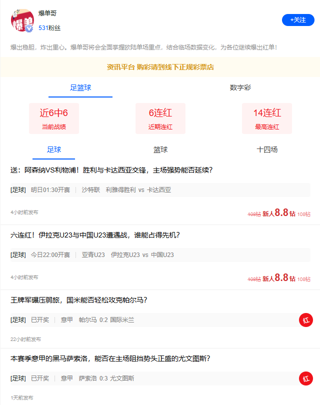 6连红稳定收米,特约专家爆单哥等您解锁今夜精析>>