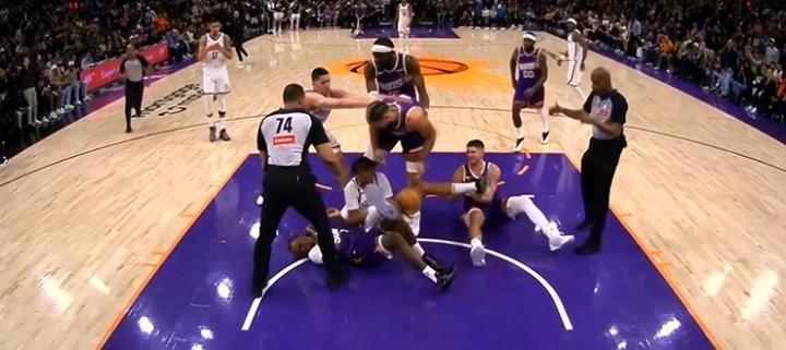 末节1分14秒,太阳102-100领先,狄龙与杰明争抢地板球,哨响后狄龙紧握球不放,杰明从身后将其推飞,点燃冲突。此前曼恩被阿伦推倒致后脑勺磕地,阿伦已领一级恶意犯规,情绪隐患已存。