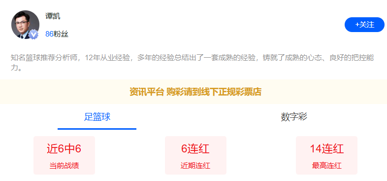 专家谭凯六连红!更多篮球信心场次推荐点点关注不迷路!