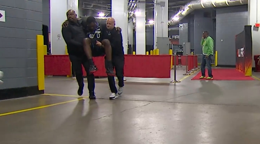 NBA常规赛火箭对阵爵士的比赛进行到第二节,一次快攻回合中,伊森在完成跟进暴扣时撞飞了文斯·威廉姆斯。后者当场跪倒在场边,腿部疑似出现反常弯曲,随后被两名工作人员抬离赛场,本场比赛未再回归。