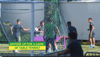 在索契的训练营里,巴西三人组库蒂尼奥,热苏斯和马塞洛在训练期间玩起了足球乒乓,他们手脚并用在紫色的球桌上完足球乒乓。