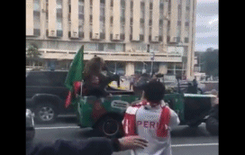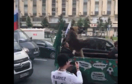 只见一头棕熊坐在敞篷车上游街,吹着呜呜祖拉,还与一旁拍照围观的球迷互动。看来战斗民族果真强悍啊,棕熊也成宠物了~