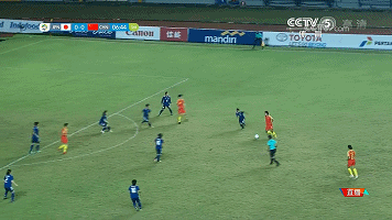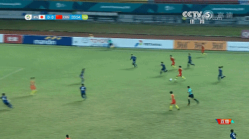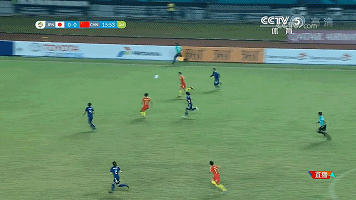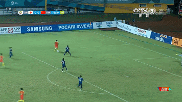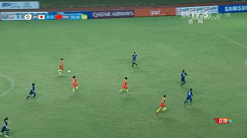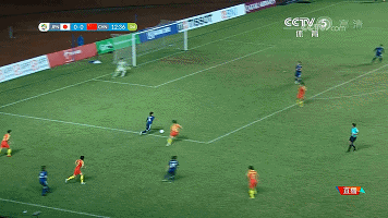 上半场比赛中,日本队面对中国队体格优势明显,体能不输技术不差的前场三人进攻组合时,压力非常大。中国队在上半场就完成了8次射门,而日本队只有2次。图中回合,反击中中国队直接长传找禁区中的李影,后者直接完成头球攻门。