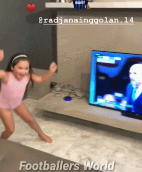 这个精彩的凌空抽射不仅让球迷为之欢呼,为纳因戈兰打气的还有在家中观看直播的女儿。在家中观看比赛直播的女儿也非常开心,蹦蹦跳跳亲吻电视机庆祝爸爸的精彩进球。小女儿更是萌翻了网友,第一次亲错人还特地返回去再亲了一遍。
