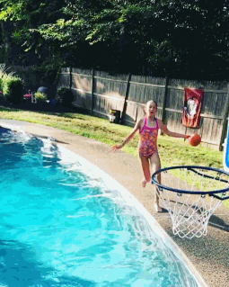 前NBA球员白曼巴布莱恩的女儿在泳池边完成胯下飞扣。