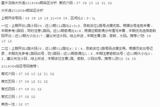 2019064期大乐透 星外流烟后区胆码07单挑02 07