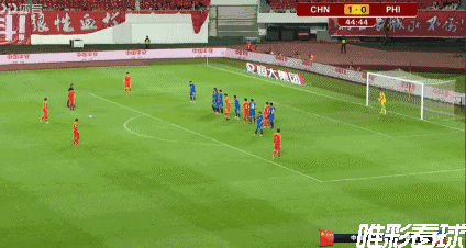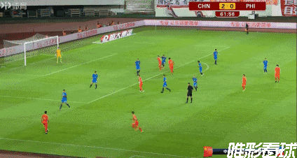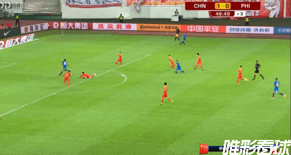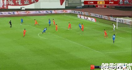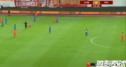 第14分钟,国足率先打破僵局,李磊前场左路反抢断球后,下底半高球给到门前,前点的谢鹏飞铲射没有打到,中路的吴曦倒地铲射轻松打进,国足1-0菲律宾。