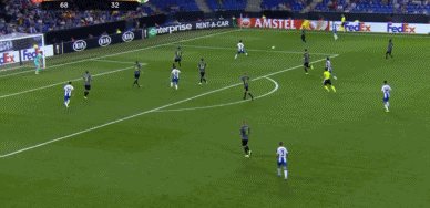 第52分钟,西班牙人长传反击,后场过顶球送到禁区右侧,巴尔加斯沉底传中,武磊高速前插,倚住对方后卫倒地捅射,皮球被对方门将封出底线。