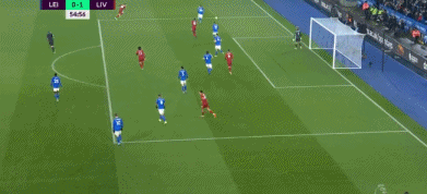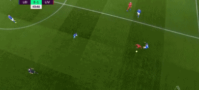 第74分钟,菲尔米诺前场右路得球转身传球,米尔纳得球分边,亚历山大-阿诺德前场右路右脚低平球传中,菲尔米诺后点得球右脚推射梅开二度,莱斯特城0-3利物浦。