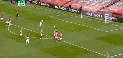 第69分钟,水晶宫反击,阿尤突入禁区12码处射门,球碰林德洛夫减速,德赫亚轻松拿到。随后拉什福德远射打偏。这时候VAR突然介入,因为林德洛夫刚才挡住射门有手球嫌疑,主裁判阿特金森观看回放后判了点球。阿尤主罚点球射左下角没力量,德赫亚扑到。VAR再次介入,因为德赫亚扑点球时有提前移动的嫌疑,VAR介入后点球重罚。水晶宫换了扎哈主罚,扎哈主罚破门,曼联0-2落后。