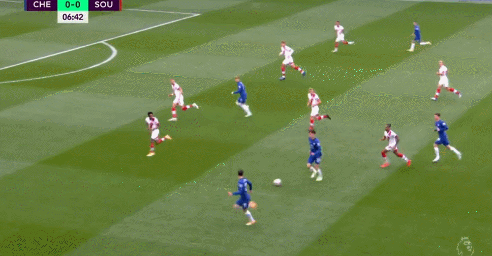 图赫尔对哈弗茨的使用一开始并不算激进,或者说所谓的3-4-2-1体系里,哈弗茨这个左侧的十号位和原来的八号位没什么太大的区别。但是图赫尔在没有经过系统训练的情况下,就给哈弗茨布置了更多的抢点任务,以及在肋部会形成更多跑位线路精巧的反跑反插。