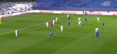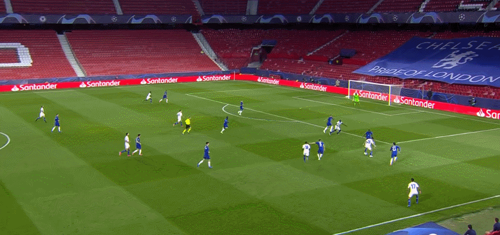 首回合面对皇马有些摸不着头脑的3后卫体系,图赫尔依然是立足于防守。而对于哈弗茨而言,他是伪9,但也是锋线和中场的一个衔接点。为了限制皇马的中场,哈弗茨更多地进行回撤,让齐耶赫配合维尔纳去冲击对手的肋部。