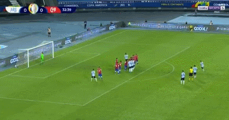 美洲杯阿根廷VS智利,34分钟梅西禁区弧顶左脚任意球射门,皮球飞入球门右上死角。1-0,阿根廷首开纪录!这也是梅西职业生涯第57次任意球直接破门。