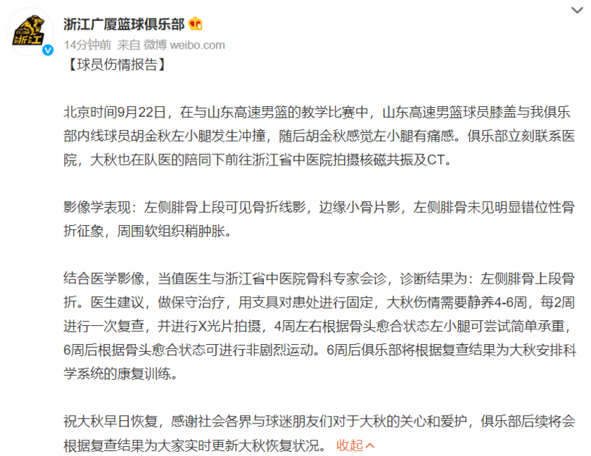 nba直播讯 据媒体人勇方方报道,广厦球员胡金秋在今天的热身赛中小腿骨折。