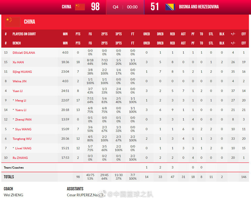 中国女篮:李梦17分3篮板3助攻,李月汝13分9篮板,杨力维12分3助攻2抢断,武桐桐12分3篮板4助攻3抢断,韩旭18分8篮板,黄思静7分8篮板5助攻2抢断,李缘8分5篮板7助攻,王思雨7分6助攻2抢断,张茹2分,金维娜2分。