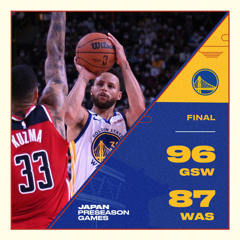 勇士队的怀斯曼得到20分和9个篮板,迪文森佐得到9分和7个篮板,库里7投1中得到6分、3个篮板、2次助攻和4次失误。普尔10投1中得到5分,维金斯8投1中得到5分。奇才队的八村塁得到13分和9个篮板,比尔得到9分,莫里斯得到9分和5次助攻,波尔津吉斯得到7分、4个篮板、4次助攻和4次抢断。