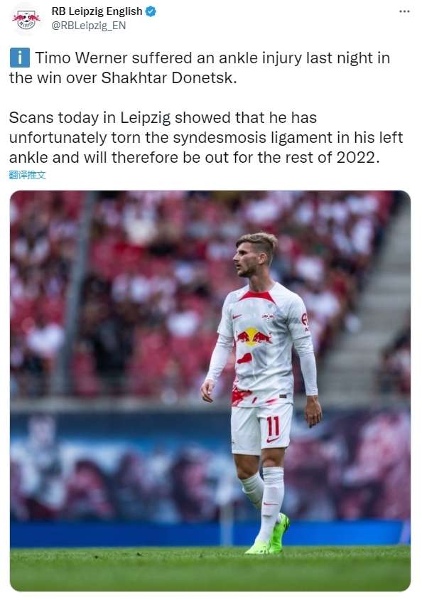 nba直播讯 莱比锡官方公告:德国前锋维尔纳左脚踝韧带断裂,将缺席今年剩余的全部比赛。