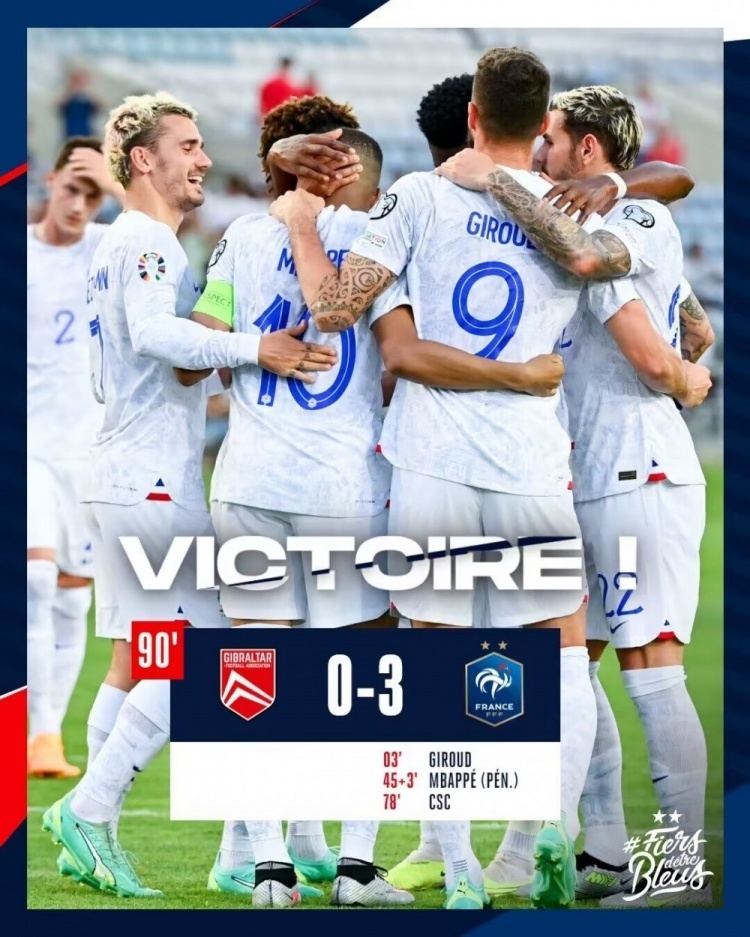 nba直播讯 北京时间6月17日凌晨2点45分,2024年欧洲杯预选赛B组第3轮,法国客场挑战直布罗陀。上半场吉鲁破门,姆巴佩点射;下半场姆巴佩造乌龙。最终法国客场3-0完胜直布罗陀,法国欧预赛开局取得三连胜。