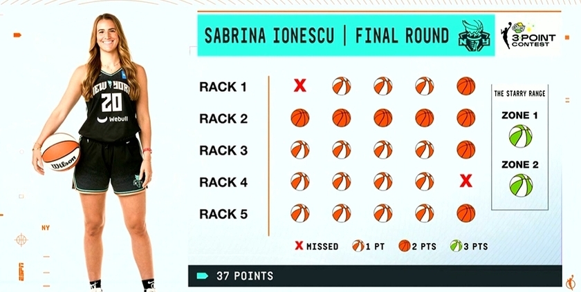 nba直播讯 WNBA三分大赛今日进行,纽约自由人的球星赛布里娜-约内斯库夺冠!她在决赛轮27投25中,拿到37分夺冠,并创造了NBA和WNBA的三分大赛得分纪录!