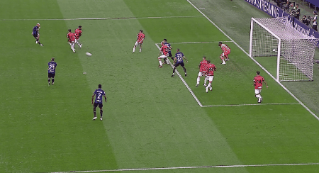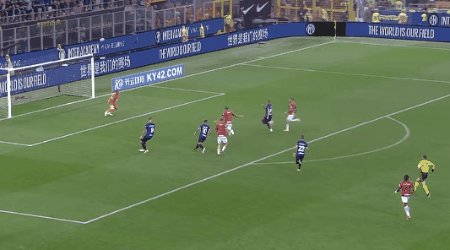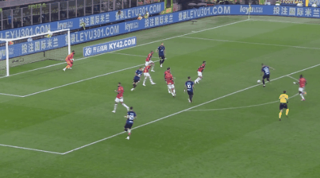 第38分钟,邓弗里斯横传,图拉姆晃开角度后兜射打出世界波,国际米兰2-0!