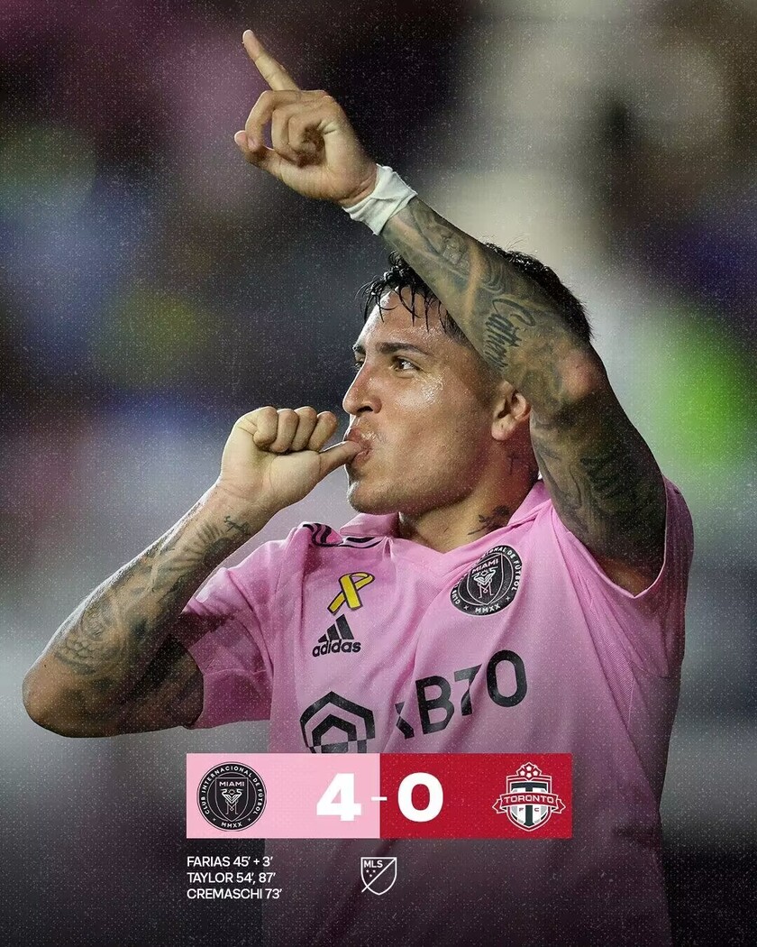 第87分钟,法里亚斯挑传禁区右路泰勒停球后小角度爆射破门,迈阿密国际4-0!