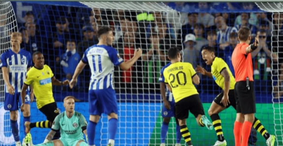 第28分钟,若昂-佩德罗禁区内倒地,主裁判看过VAR后判罚点球,若昂-佩德罗点射破门,打进布莱顿队史欧战首球!布莱顿1-1!
