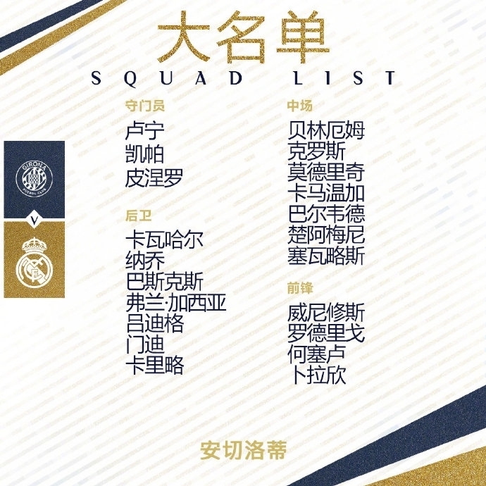 中场:贝林厄姆,克罗斯,莫德里奇,卡马文加,巴尔韦德,琼阿梅尼,塞巴略斯