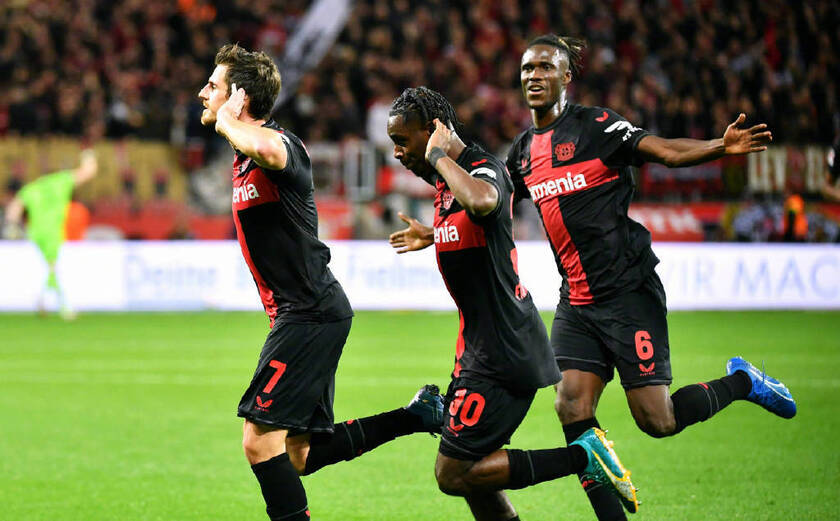 第90+2分钟,卡拉巴赫禁区内手球送点,博尼法斯点射绝杀,勒沃库森1-0!