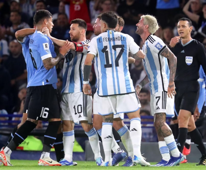 nba直播讯 世预赛阿根廷对阵乌拉圭,上半场双方发生冲突。
